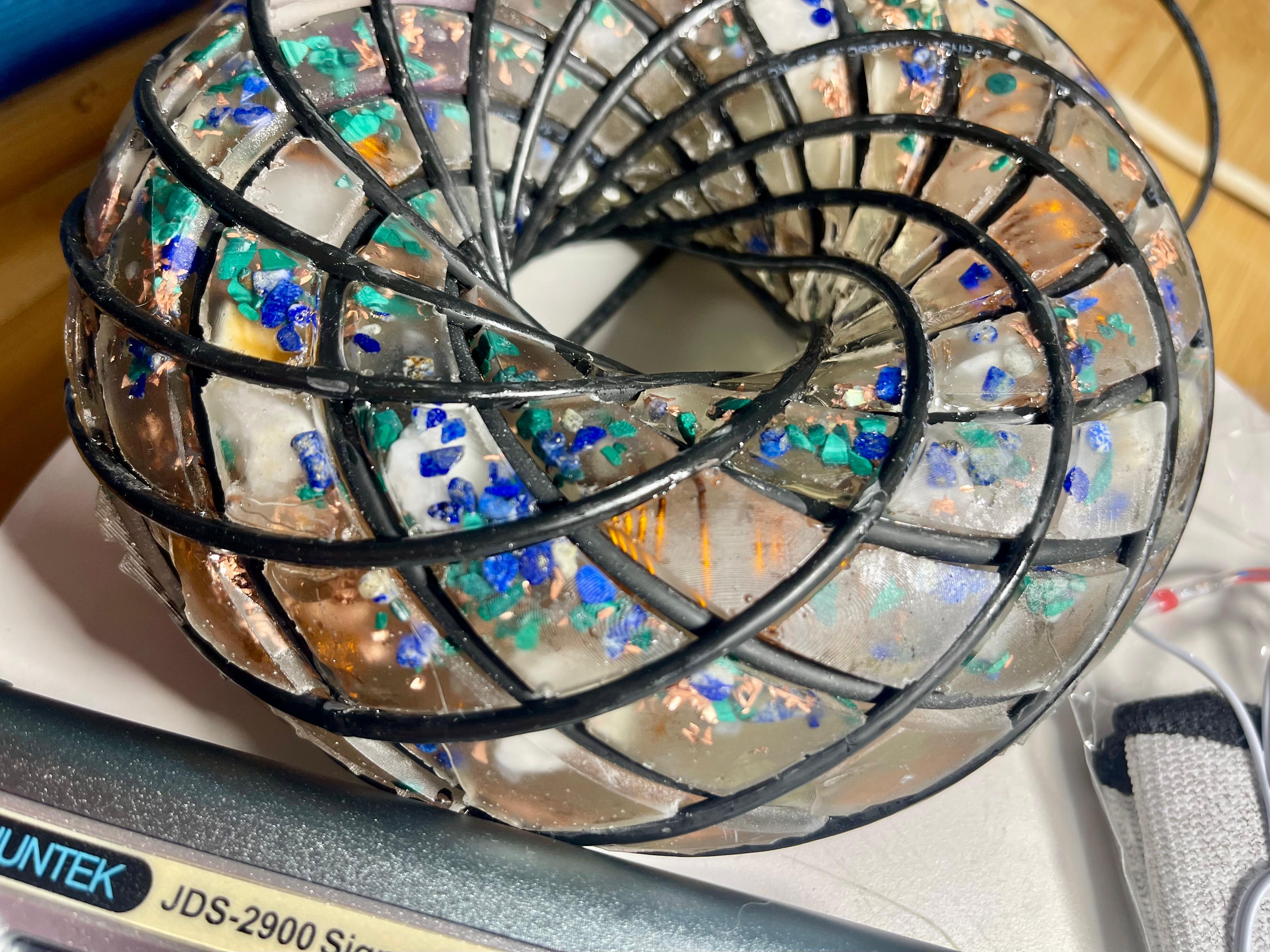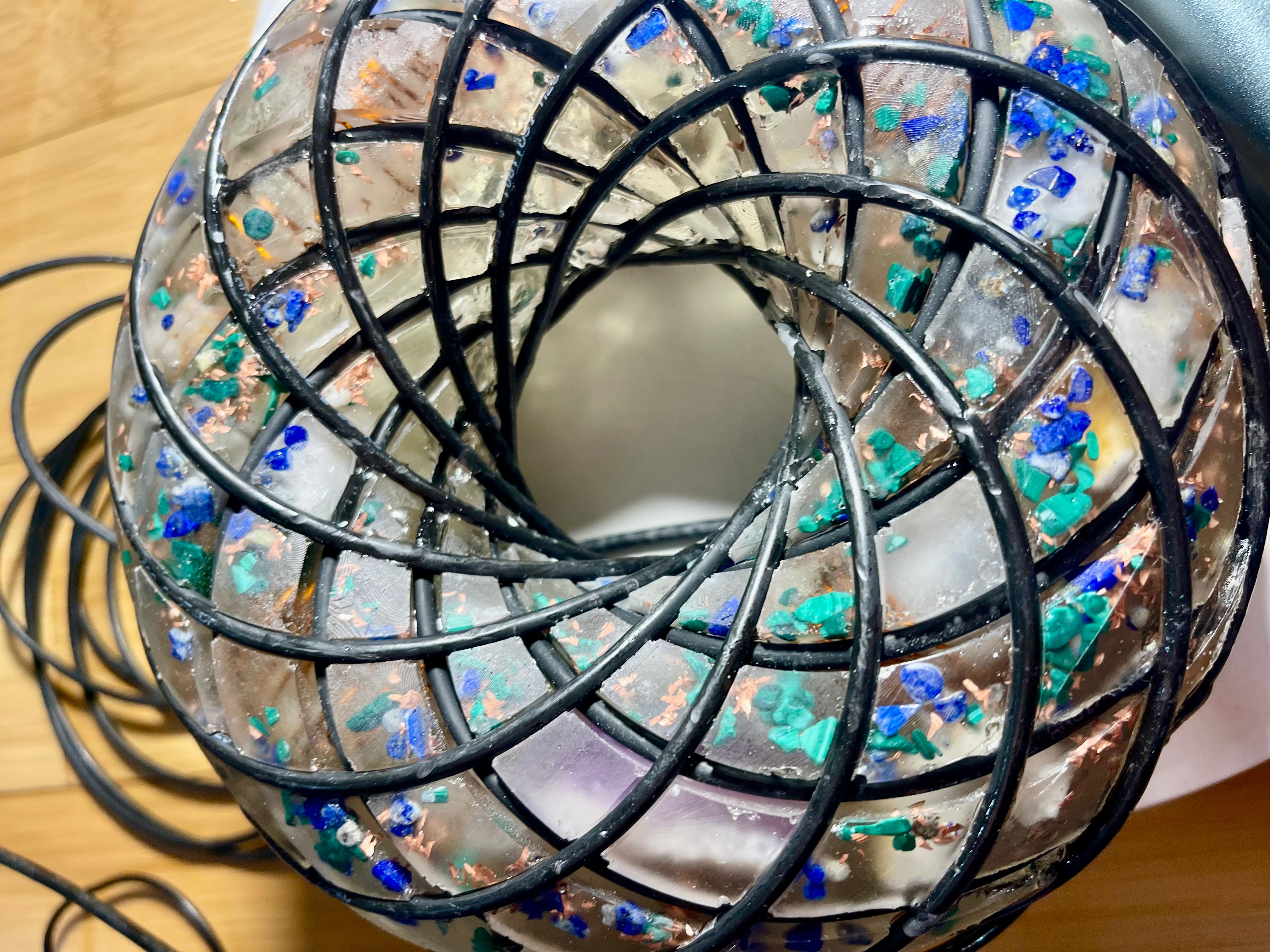 Noua noastră bobină toroidală de 20 cm este o creație unică, realizată manual din 12 spire de cupru pur, turnată în rășină transparentă și încărcată cu cristale naturale de sodalit și malachit, două pietre cu vibrații profunde de echilibru și claritate.