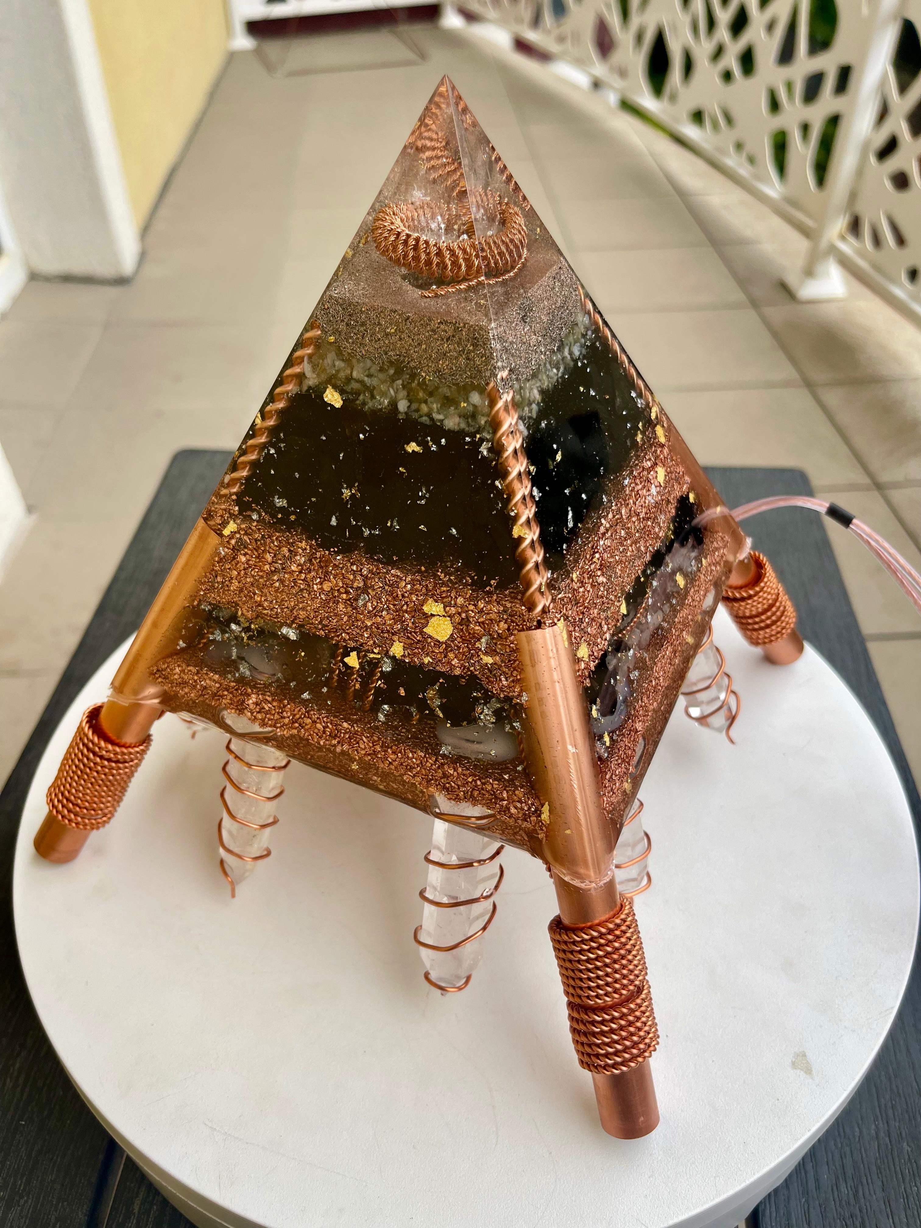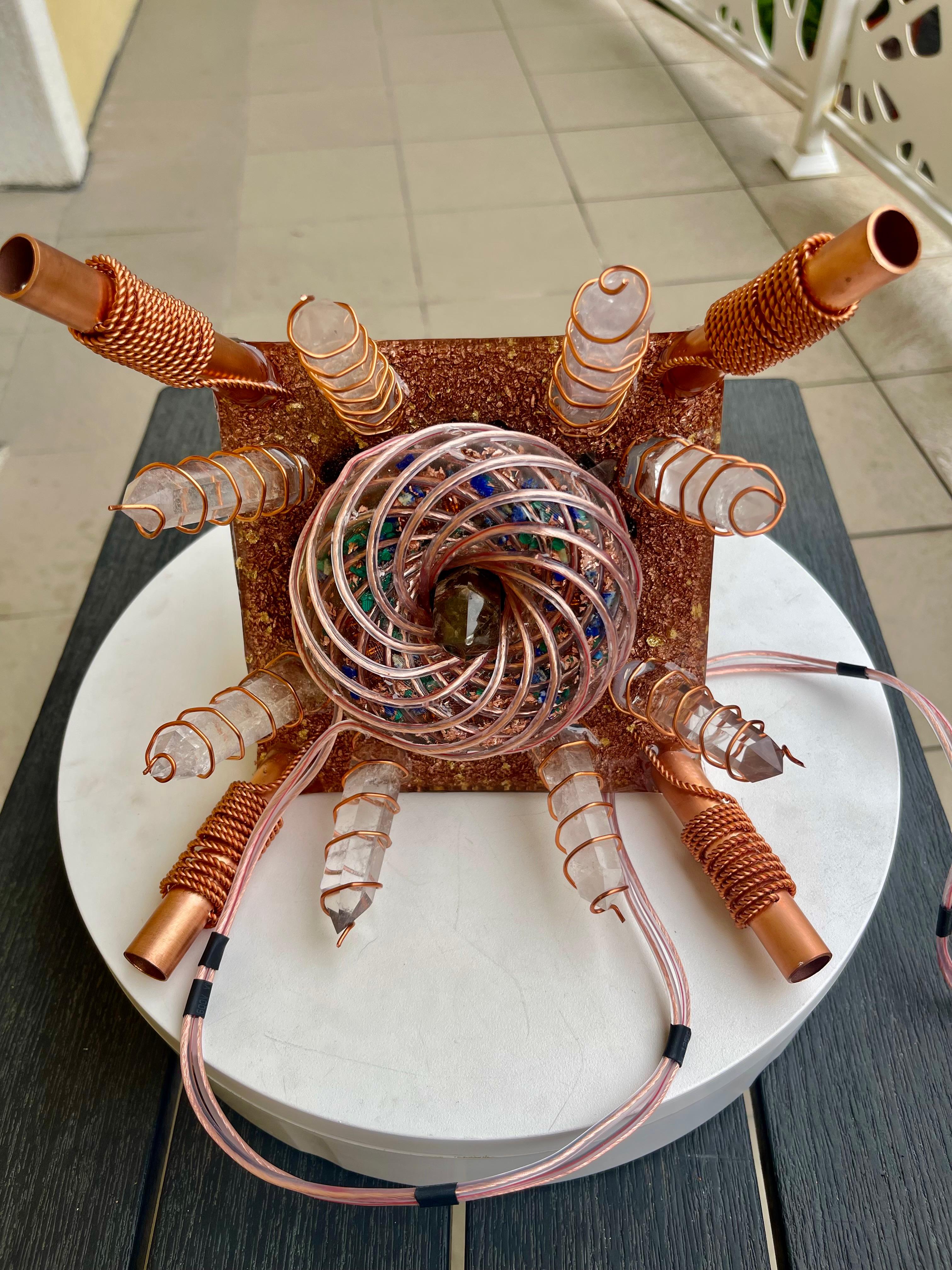 În inima acestui orgon se află un dispozitiv toroidal activ, care poate fi conectat la priză pentru a emana frecvențe specifice. Acesta creează un câmp continuu de energie toroidală, cunoscut pentru efectele sale de armonizare, regenerare și expansiune a conștiinței. Este practic un “motor energetic” care ține întreg spațiul într-o vibrație înaltă.