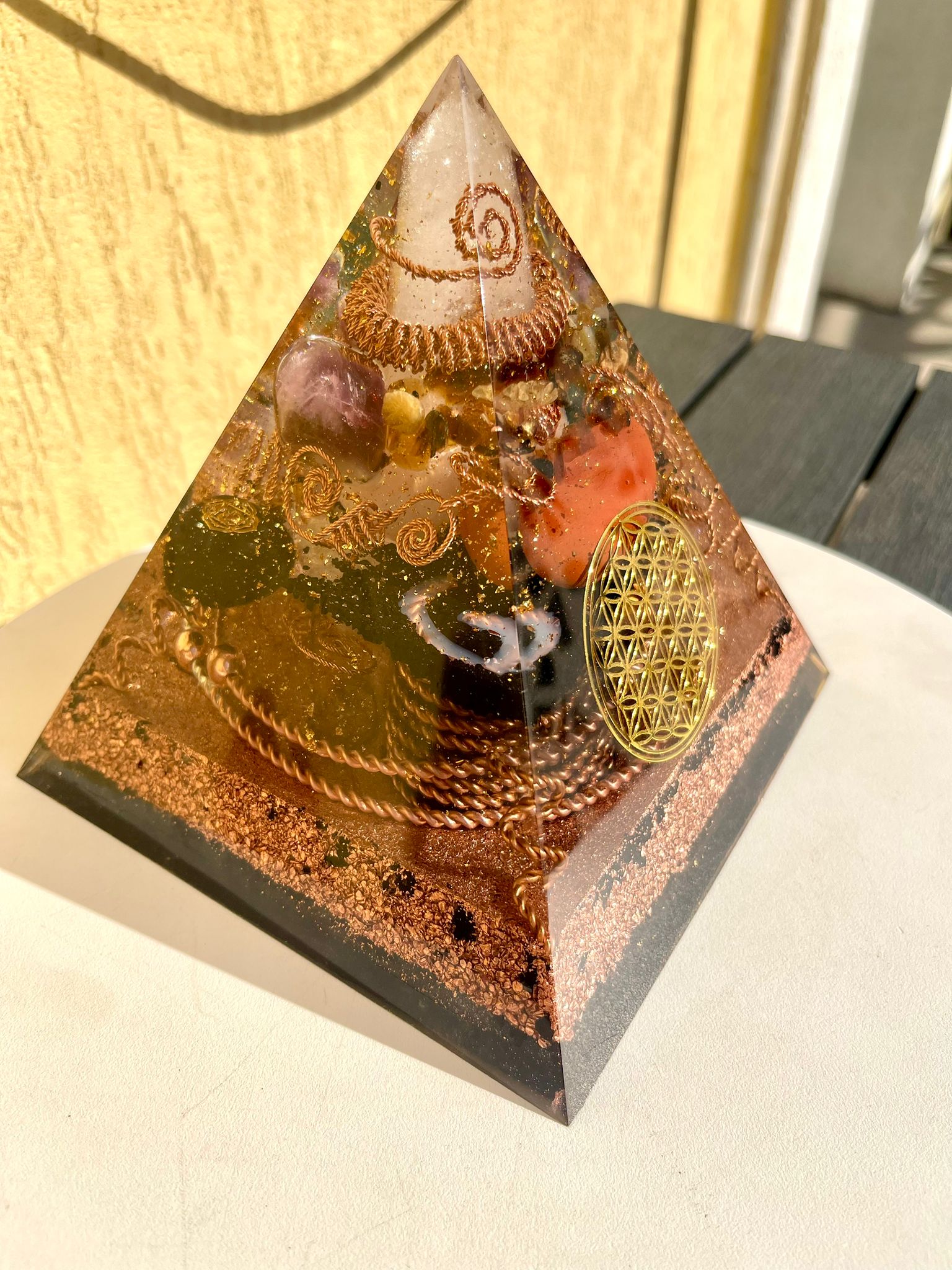 La baza orgonului tronează Floarea Vieții, unul dintre cele mai puternice simboluri sacre ale creației universale. Este o matrice a întregii existențe, un tipar geometric ce rezonează cu ADN-ul uman și cu structura cosmosului.