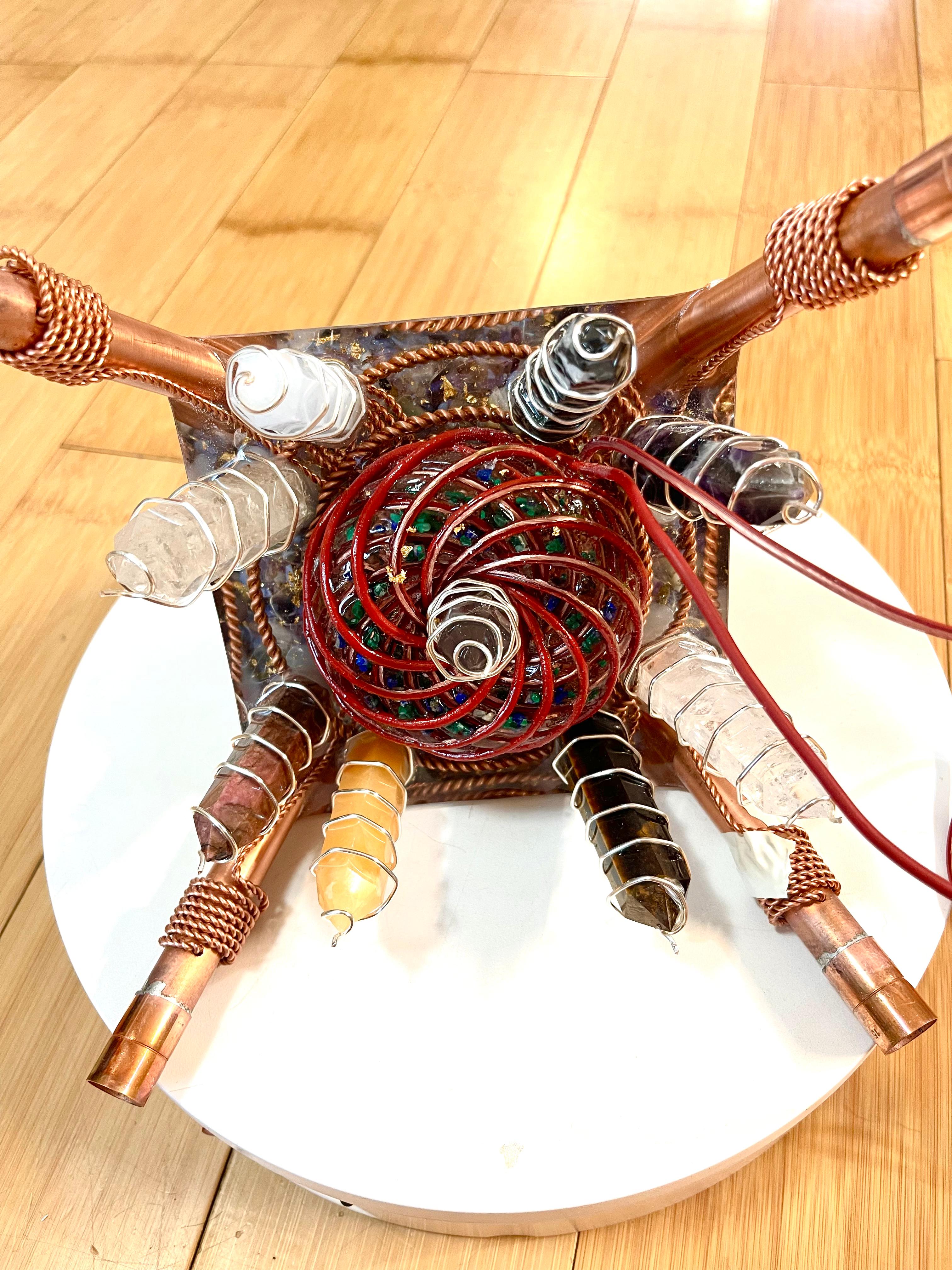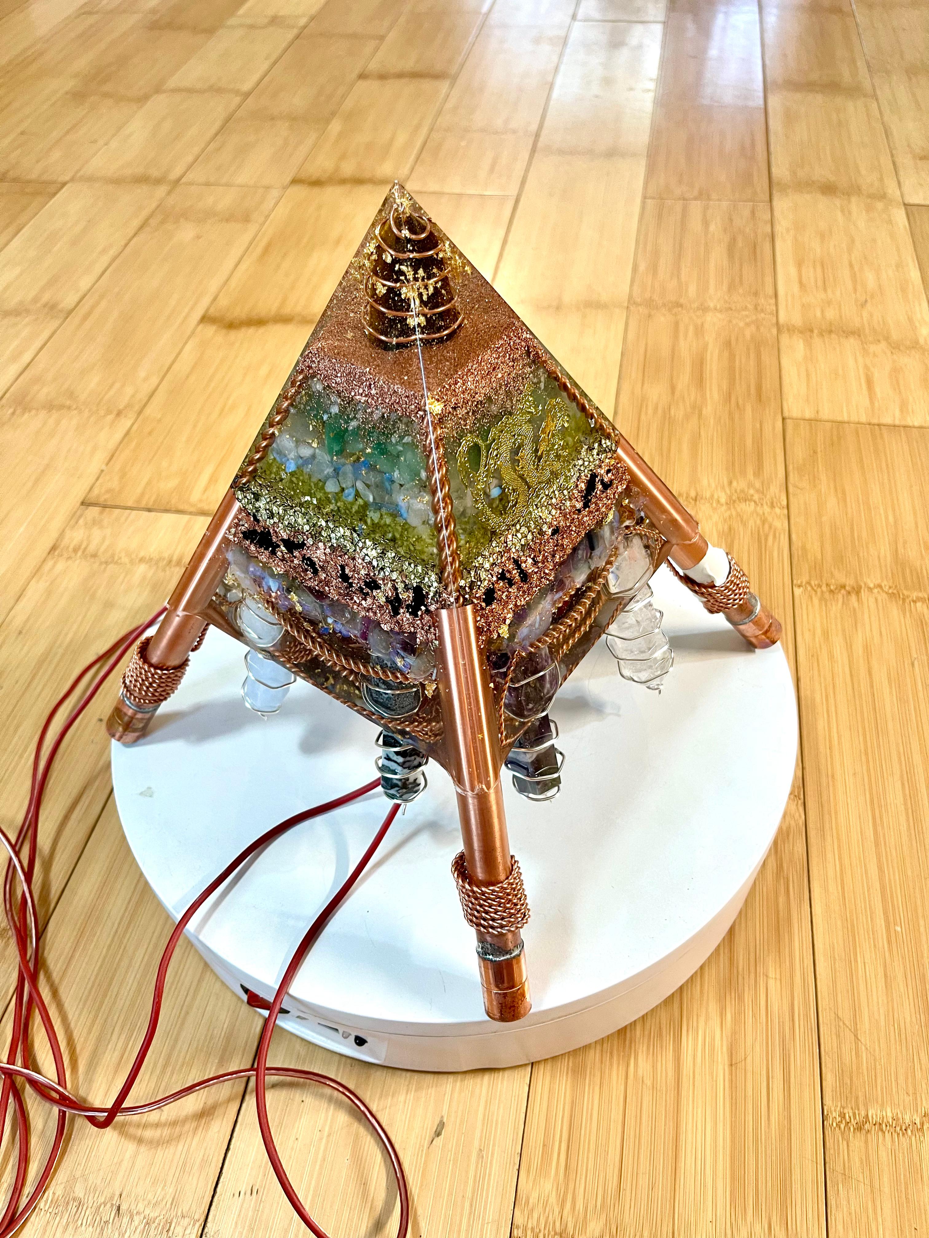 La vârful piramidei se află un orgon complex, care combină structura clasică de orgonit cu tehnologia Tensor, GANS și Nanoplante, creând un instrument puternic pentru echilibrarea și amplificarea fluxurilor de energie subtilă.