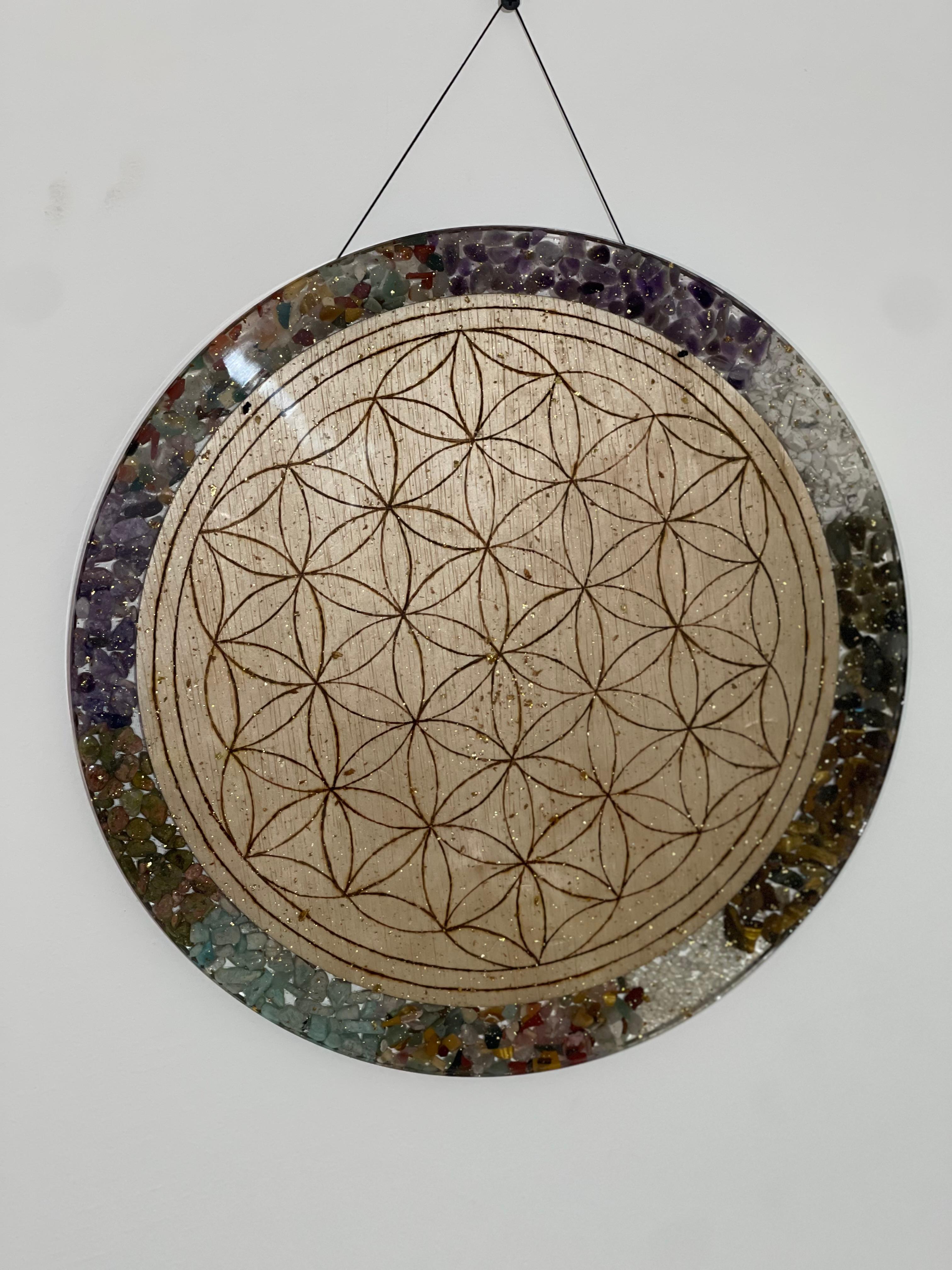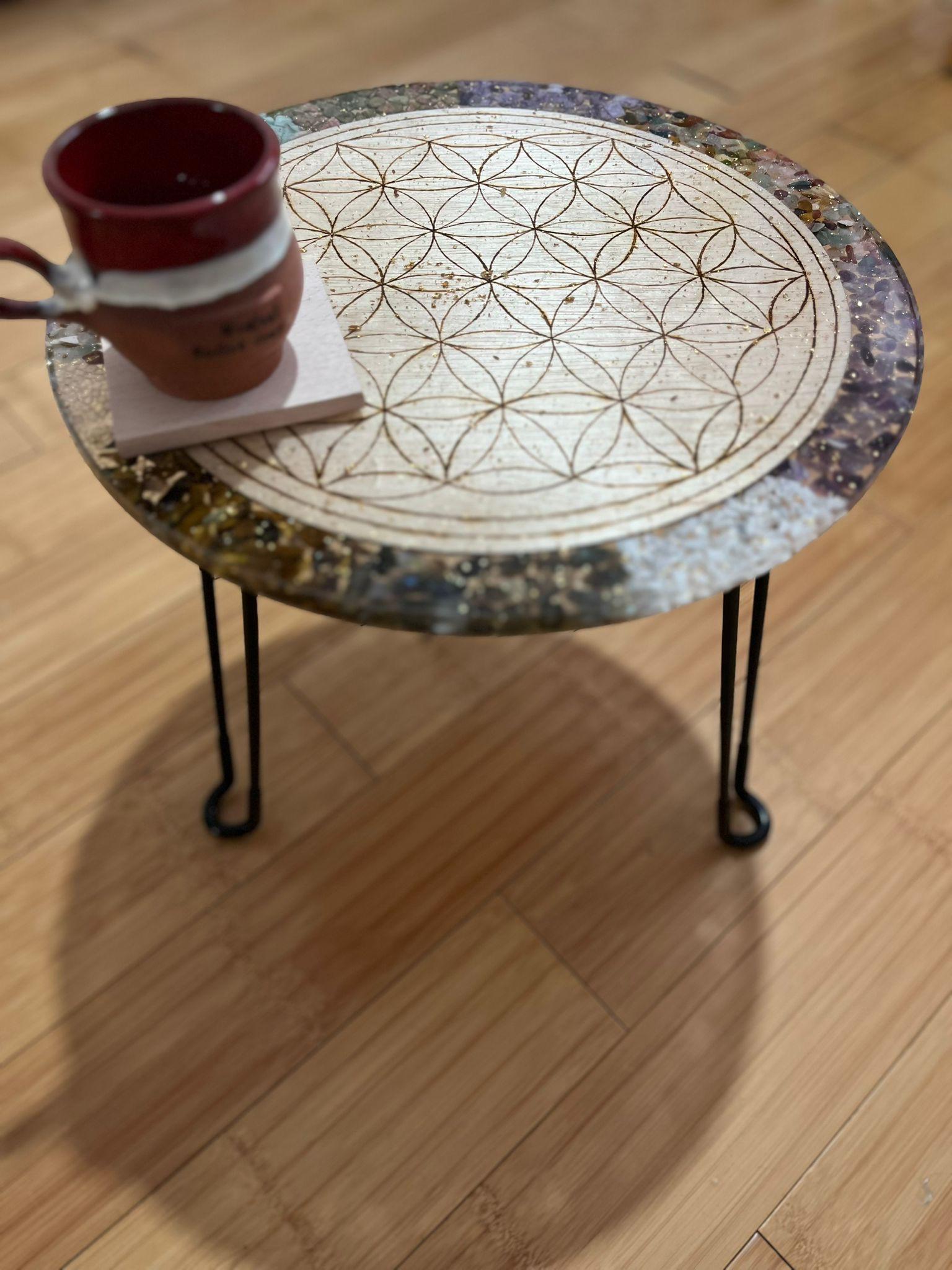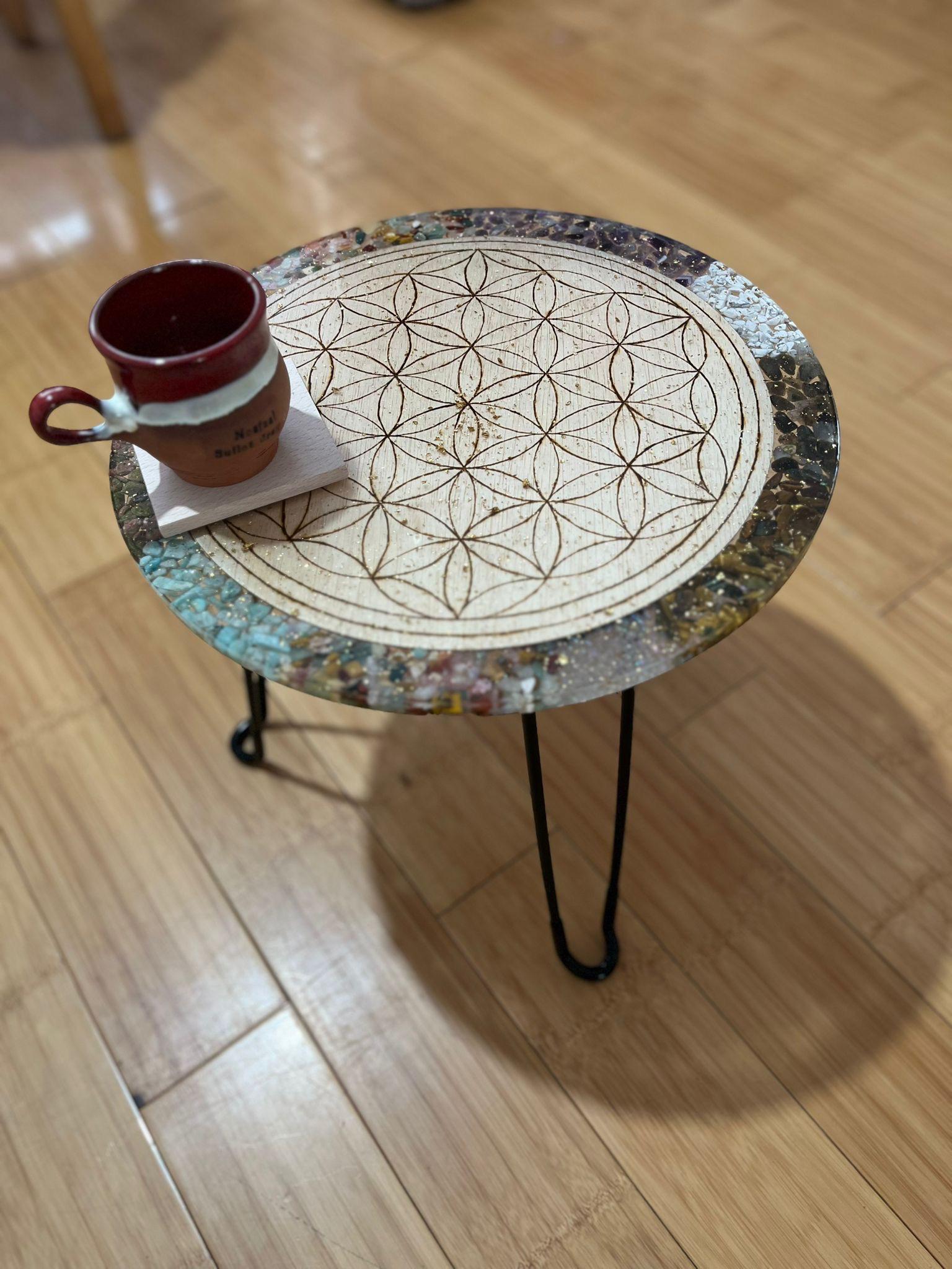 Această piesă unică, ce poate fi folosită ca masă decorativă sau tablou de perete, este decorată cu simbolul sacru al Florii Vieții – o reprezentare universală a creației, echilibrului și conexiunii dintre toate formele de viață.